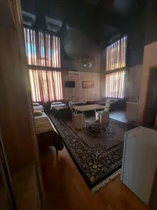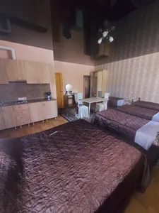 2 кухни: на 2 и 3 этажах. Посуды куча, термопот, микроволновка, варочная панель, 2 холодильника. В общем всё что нужно, есть в данном гостевом доме. Есть бассейн, место для вечерних посиделок, мануальная зона, кстати тоже с мини кухней, столики, крытая беседка на большую компанию (п.с: но в ней не удалось посидеть). Детей, животных, мат, крик, стоны и тому подобное не слышно...стены толстые.