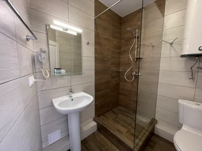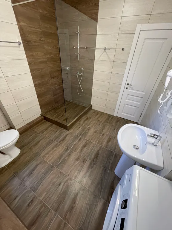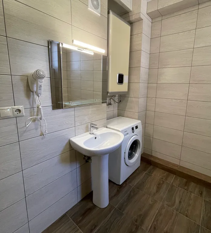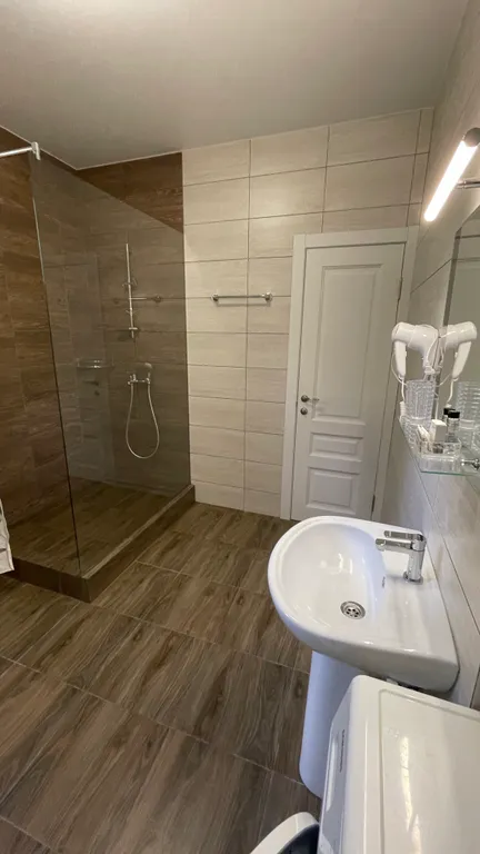 фен, зеркало с подсветкой, раковина, душ, туалет, бойлер, сушка для белья, туалетные принадлежности в день заезда для каждого гостя.