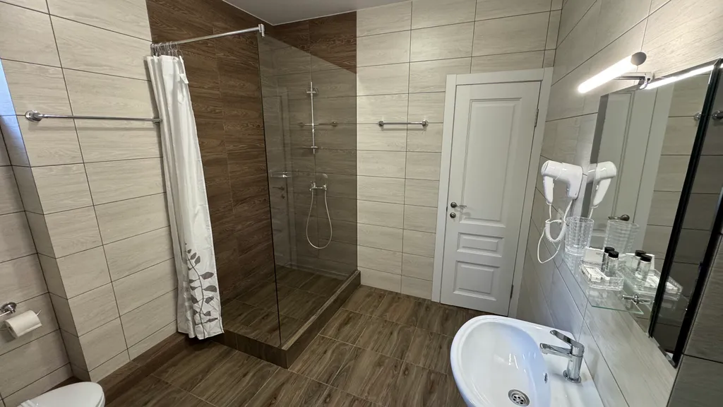 каждый номер оборудован: сплит системой, телевизором, большой двух спальной кроватью, раскладным диван кроватью, постельным бельём и полотенцем по 2 штуки на каждого гостя, халат и тапочки для каждого взрослого гостя.