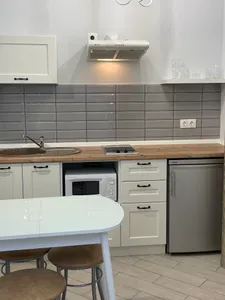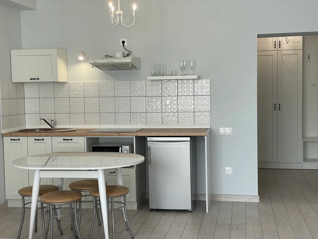 - плита для самостоятельного приготовления завтраков, обедов и ужинов, вся необходимая посуда для приготовления пищи, столовые приборы и бокалы, микроволновая печь, электрический чайник, холодильник, вытяжка, обеденный стол со стульями